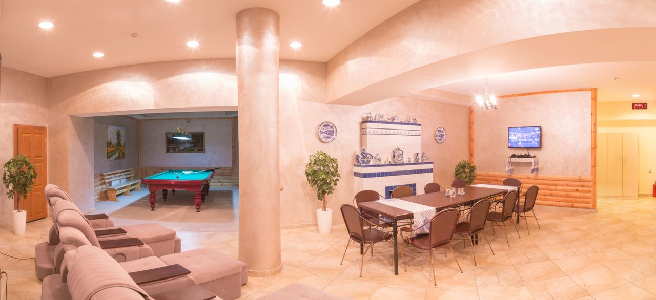 Не хочется в бассейн? Не беда! Вместо этого можно посидеть в нашей комнате отдыха. Мы ставили своей целью создать здесь уютный, практичный интерьер из преимущественно натуральных, безопасных материалов, подобрать мебель, которая будет в равной степени удобной и красивой. Надеемся, что он придется вам по душе! Для поддержания атмосферы отдыха мы можем предложить вам бильярд, камин и караоке. Также у нас имеется бар, где вы можете приобрести блюда русской и японской кухонь. Главное помните, что плотная трапеза незадолго перед посещением парной - это не самая удачная идея, по мнению врачей. А вот после парной можно трапезничать смело!